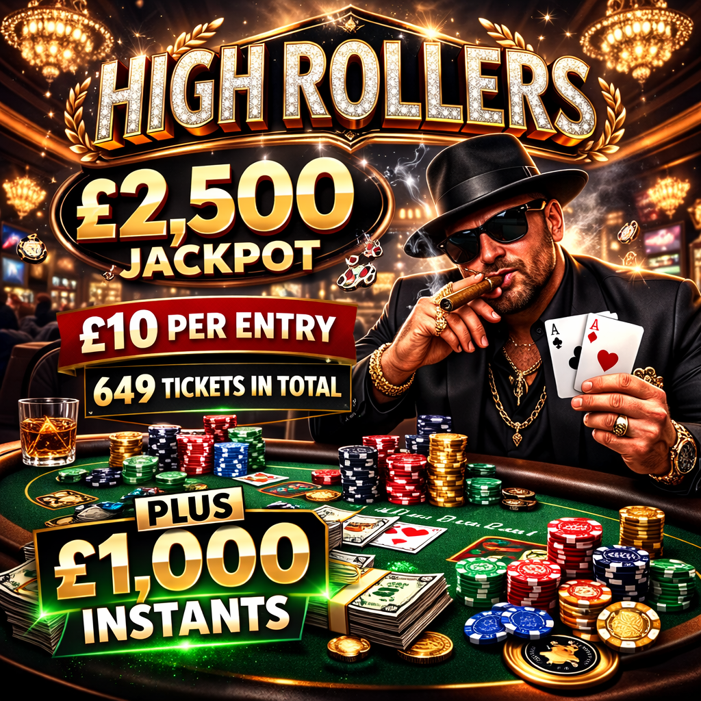 BUY TICKETSENDS 3rd Mar at 9:00 PMHIGH ROLLERS - £2.5K JACKPOT + £1K INSTANTS