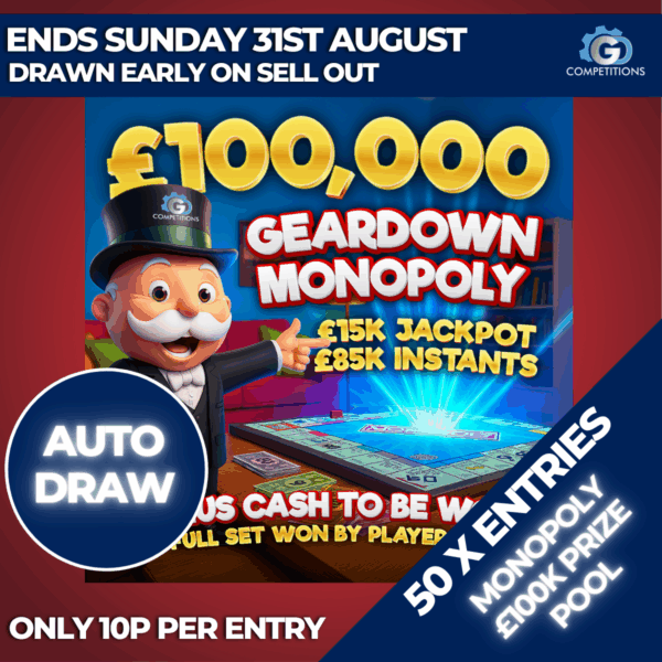 BUY TICKETSENDED ON 31st Aug, 2025 at 10:00 PMMINI DRAW – 50 X ENTRIES INTO MONOPOLY £100K PRIZE POOL