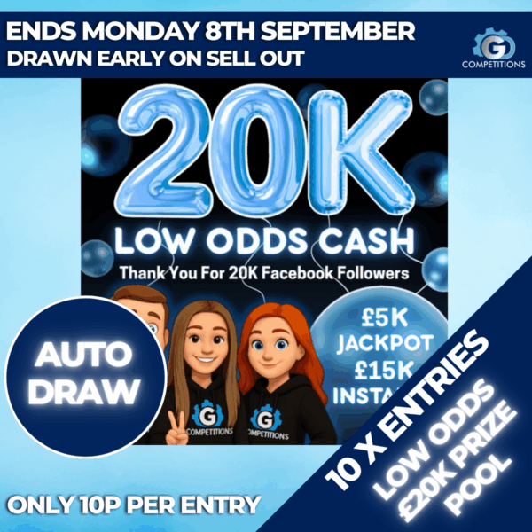 BUY TICKETSENDED ON 1st Sep, 2025 at 10:00 PMMINI DRAW – 10 X ENTRIES INTO LOW ODDS £20K PRIZE POOL