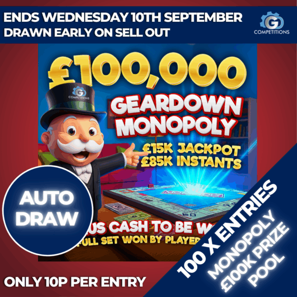 BUY TICKETSENDED ON 10th Sep, 2025 at 10:00 PMMINI DRAW – 100 X ENTRIES INTO MONOPOLY £100K PRIZE POOL