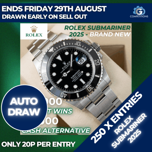 BUY TICKETSENDED ON 29th Aug, 2025 at 6:00 PMLAST CHANCE MINI DRAW – 250 X ENTRIES INTO ROLEX
