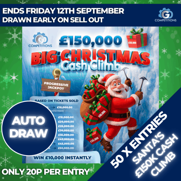 BUY TICKETSENDED ON 12th Sep, 2025 at 10:00 PMMINI DRAW – 50 X ENTRIES INTO SANTA'S £150K CASH CLIMB